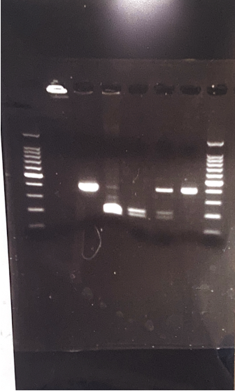 電気泳動の試料は左から順にDNAサイズマーカー、DNA溶液、PCR溶液、制限酵素処理液、G/Gコントロール、G/Aコントロール、A/Aコントロール、DNAサイズマーカーです。制限酵素処理液(左から4列目に光っているもの)がG/Gコントロール(右から4列目に光っているもの)のバンドと一致するので、私のALDH2の遺伝子の型はG/G型だと言えます。